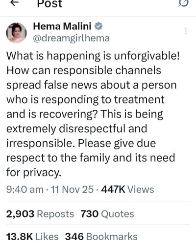 Mumbai, November 11, 2025: Actress and Member Parliament Hema Malini has reacted strongly to news aired by media on demise of her husband and veteran Actor Dharmindra Deol.