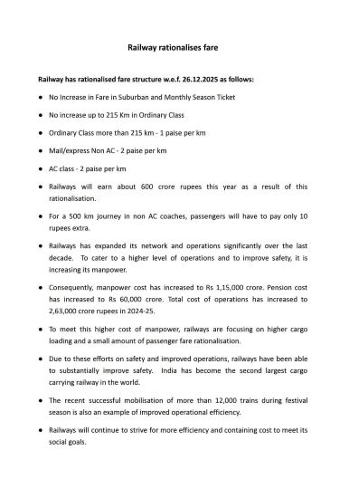 New Delhi, December 21, 2025: The Railway has announced a new fare structure effective from December 26, 2025, with no fare increase for journeys under 215 km in Ordinary Class. For journeys beyond 215 km, there will be a fare hike of 1 paise per km in Ordinary Class, and 2 paise per km for Mail/Express Non-AC and AC classes. The expected revenue gain from this change is RS 600 crore, and passengers on a 500 km Non-AC journey will pay an additional Rs 10.