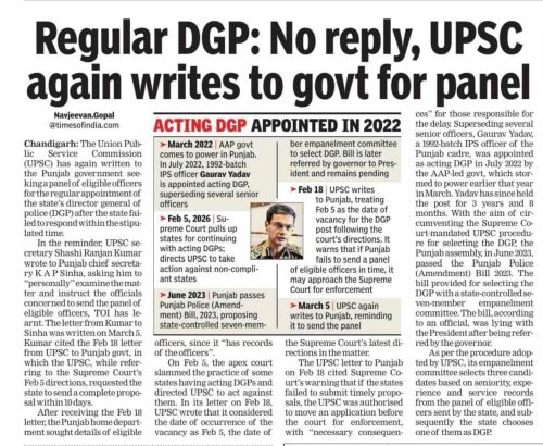 Chandigarh, March 11, 2026: Union Public Service Commission (UPSC) has again written to Punjab Government demanding panel for appointment of regular DGP.