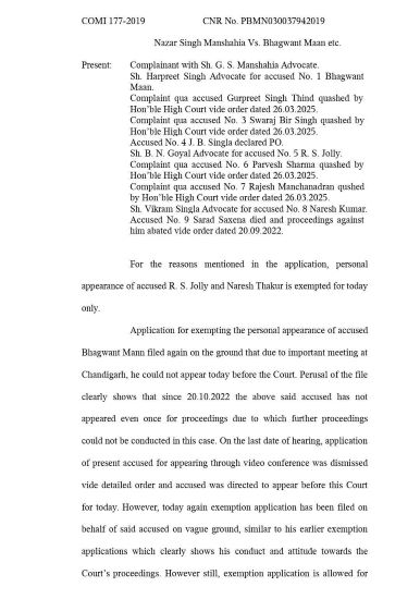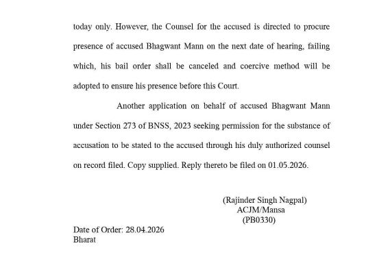 Mansa, April 29, 2026: Mansa court has summoned Chief Minister Bhagwant Mann on May 1. Court in its order has said that he should ensure his personal appearance or else his bail will be canceled and coercive method will be used to ensure his presence in the court.