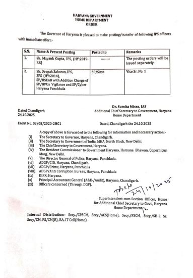 Chandigarh, October 25, 2025: Haryana Government has transferred two IPS officers.