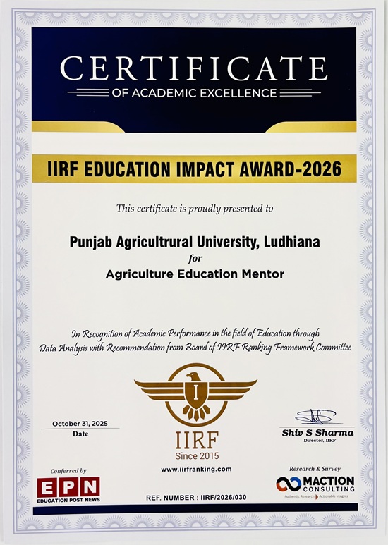 Ludhiana (Punjab), November 3, 2025:The Punjab Agricultural University (PAU), Ludhiana, has been conferred with the IIRF Education Impact Award 2026 for its outstanding role as an Agriculture Education Mentor. The award, presented by the Indian Institutional Ranking Framework (IIRF) during the 8th Industry-Academia Conclave in New Delhi, recognizes PAU’s pioneering contribution to agricultural education, research, and community outreach.