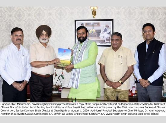 Nayab Singh Saini shared this information after receiving a copy of the supplementary report on the reservation proportion for Backward Class Block-B in urban local bodies/municipalities and Panchayati Raj institutions of Haryana from the Chairman of the Haryana Backward Commission, Judge (Retd.) Sh. Darshan Singh here today.