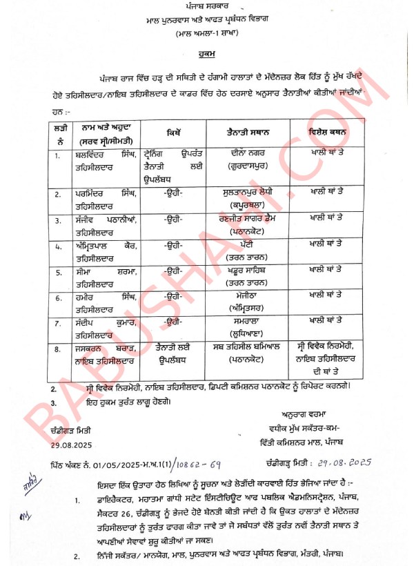 Chandigarh, August 30, 2025: The Punjab Government has ordered the transfer of seven Tehsildars and one Naib Tehsildar across the state.