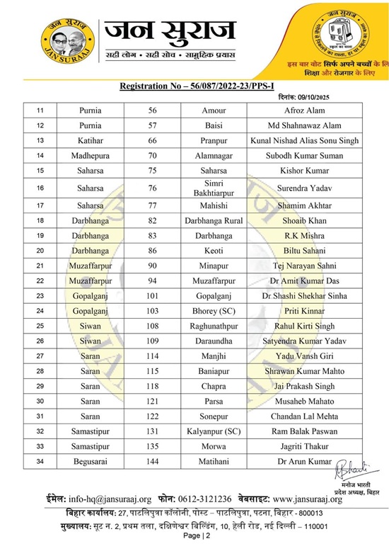 Patna (Bihar), October 9, 2025: Election strategist-turned politician Prashant Kishor, released the first list of candidates for the Bihar Vidhan Sabha polls.