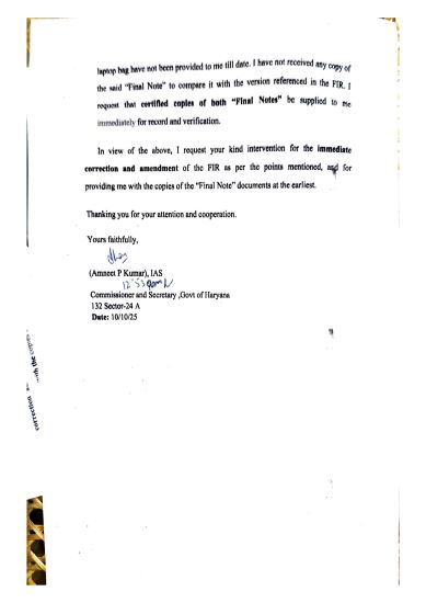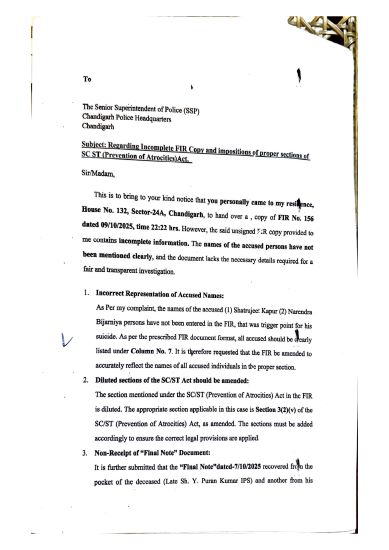 His wife Amneet P Kumar IAS has written a letter to SSP Chandigarh demanding amendments in the FIR. In the letter she said that name of the accused Shurtrujeet Singh Kapoor and Narendra Bijarnia should be added in column no 7 of the FIR where name of accused are writeen. She has also demanded that relevant sections of the SC/ST Act should also be added in the FIR. She has also demanded certified copies of 'Final Note' drafted by the deceased before committing suicide. She has claimed that she has not got copy of 'Final Note' till date.