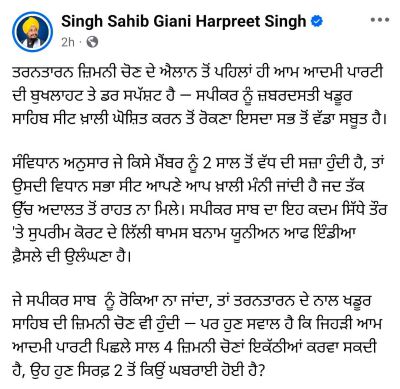 Giani Harpreet Singh attacks AAP government for not declaring Khadoor Sahib seat vacant
