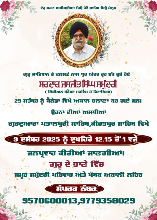 Chandigarh, December 8, 2025:The ashes of Sardar Jasjit Singh Samundri will be immersed in the Sutlej River at Kiratpur Sahib by his family on December 9.