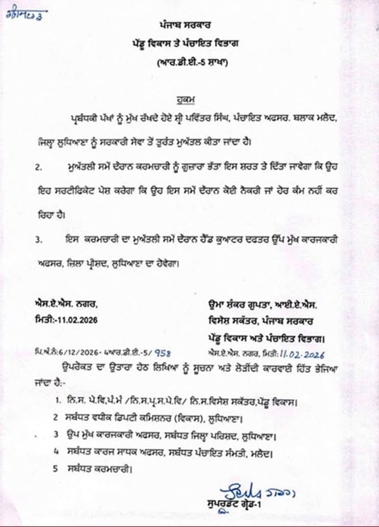 Chandigarh, February 15, 2026: The Punjab Government has issued suspension orders against Panchayat Officer Pavitar Singh, posted in Malaud.