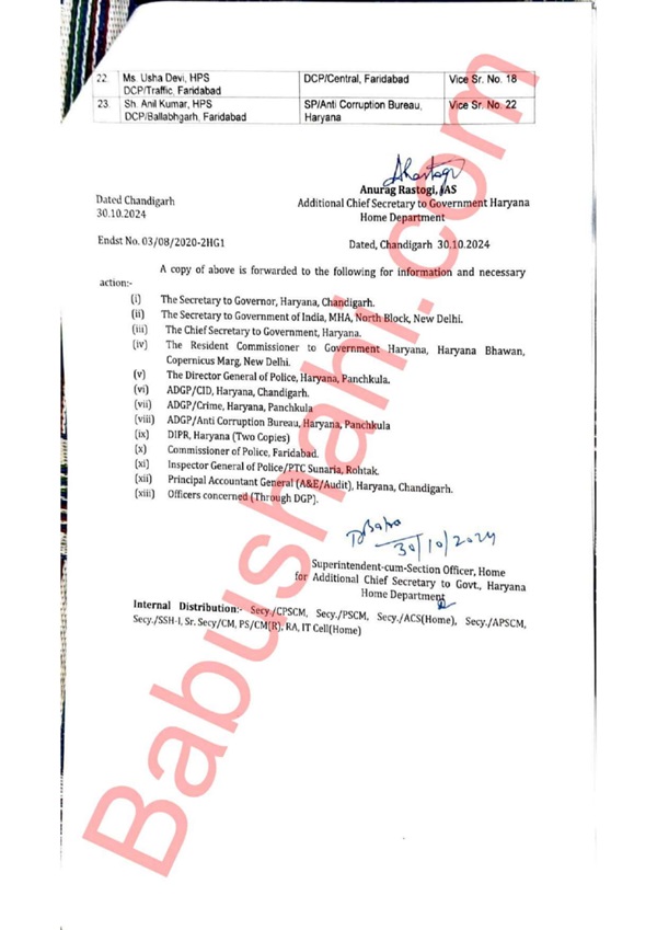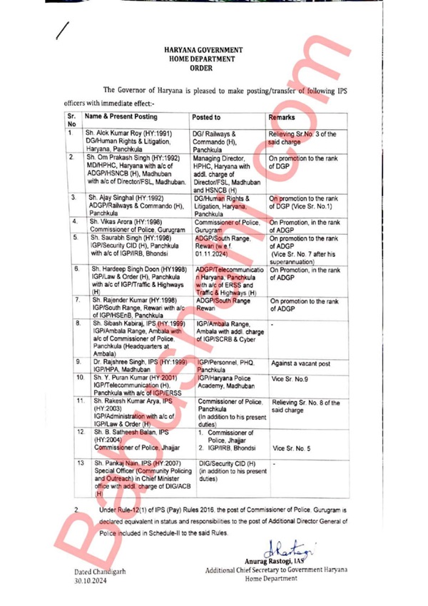 Chandigarh, October 30, 2024: The Haryana government has transferred 23 IPS/HPS officers with immediate effect.