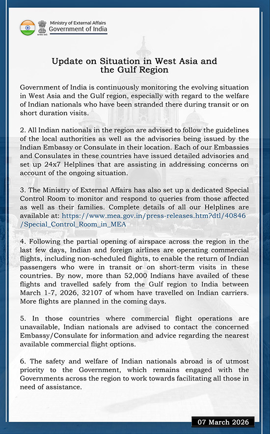 New Delhi, March 7, 2026: The Government of India is closely monitoring the evolving situation in West Asia and the Gulf region, with special focus on the safety and welfare of Indian nationals stranded there during transit or short-term visits.