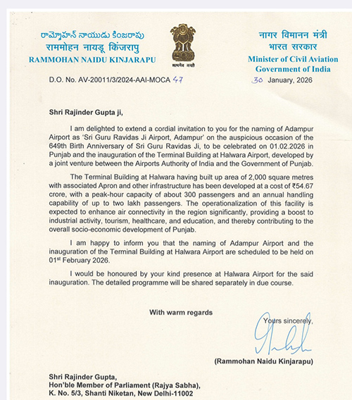 Union Civil Aviation Minister Rammohan Naidu Kinjarapu has formally invited Rajya Sabha Member Rajinder Gupta to attend the inauguration of the new terminal building of Halwara Airport on February 1, 2026, an event to be graced by Prime Minister Narendra Modi.