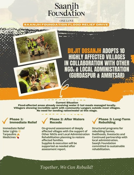 By adopting 10 villages and committing to long-term rebuilding, Diljit Dosanjh and Saanjh Foundation are setting a strong example of community-driven relief. “Together, we can rebuild,” the foundation said in its statement.