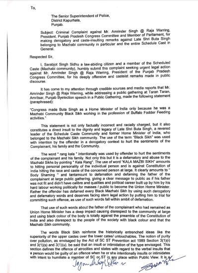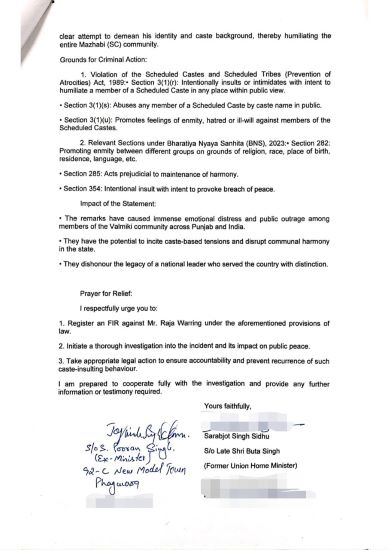 Kapurthala, November 5, 2025: Punjab Police has registered an FIR against Punjab Congress President Amarinder Singh Raja Warring on complaint of son of former Home Minister Buta Singh.