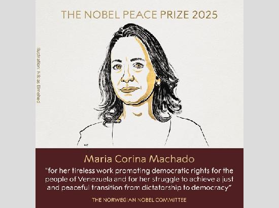 Oslo [Norway], October 10, 2025 (ANI): The 2025 Nobel Peace Prize winner has been announced as Maria Corina Machado "for her tireless work promoting democratic rights for the people of Venezuela and for her struggle to achieve a just and peaceful transition from dictatorship to democracy."
